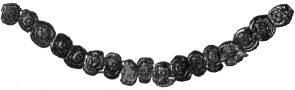 стеклянные кольца, костяное шильце, ложечка, гребешок, копоушка, янтарный перстень, кремень для выбивания огня, деревянный браслет, глиняный игрушечный шарик. Из бус особенно интересны две пронизи (из мог. 1419) от браслета из темного стекла в виде круглых пластинок с двумя дырочками и рельефными изображениями на одной женской головки впрямь, на другой мужской и женской головок, обращенных одна к другой. Из мог. 1446 происходят бусы (рис. 78) , составлявшие браслет. В мог. 1205 найдено стеклышко, по-видимому, из медальона, в форме плоского кружка в 0,015 диам., состоящее из двух слоев, — нижнего молочного цвета и верхнего синего; поверхность последнего украшена виноградным листком, контур которого исполнен с помощью тончайшей золотой пластинки, отвесно впущенной в сделанные в стекле прорезы. Монеты найдены во многих могилах [17] . В насыпи некрополя найдены: мраморная надгробная плита с греческою надписью [18] , фронтон из известняка от греческого надгробия, 4 известковых надгробия в форме голов, три плитки для укрепления такого рода надгробий, 2 амфорные ручки с именами херсонесских астиномов и 9 различных монет [19] . На верхней площадке холма, у подножия которого расположены погребения №№1391-1404, раскопки обнаружили фундаменты двух базилик, из коих одна оказалась построенной внутри другой, имевшей большие размеры (см. план на рис. 79 ). Меньшая базилика, у которой вход был в северной стене, позднее большой базилики, имевшей вход с З. В алтарной части малой базилики (Б) сохранилась in situ известковая колонка от престола, который примыкал