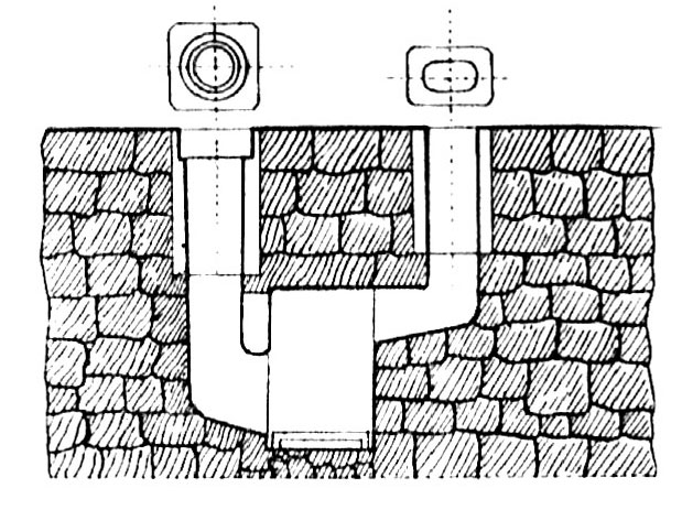 прямоугольной ямы К1 (глуб. 3,55 м) канал и со дна ямы ведет по уклону в более глубокую (6,30 м), также высеченную в скале яму К2. В канале перед большой ямой найдены пять гончарных канализационных труб