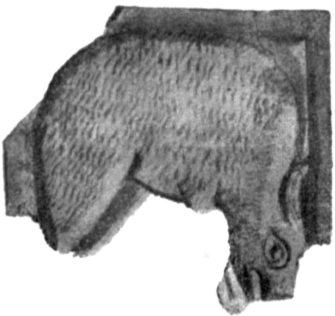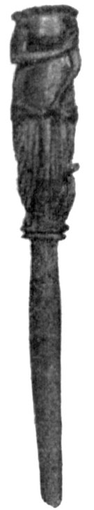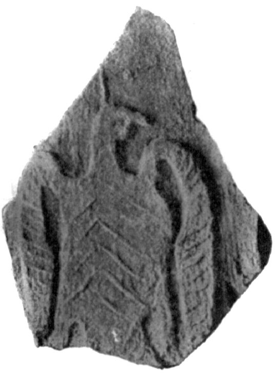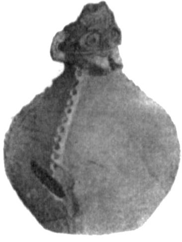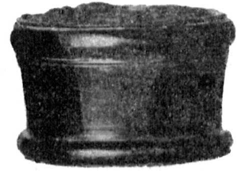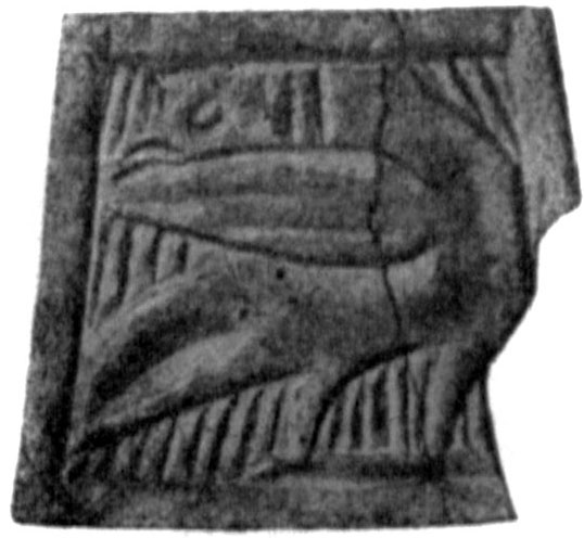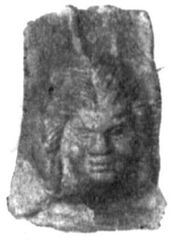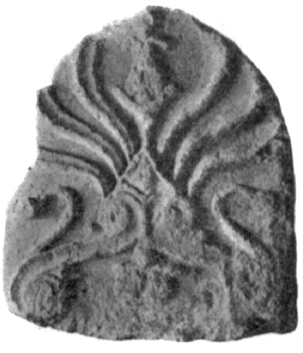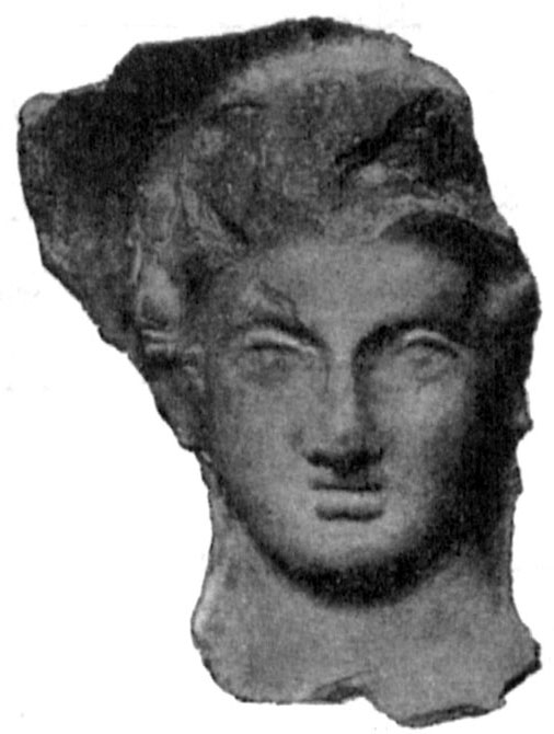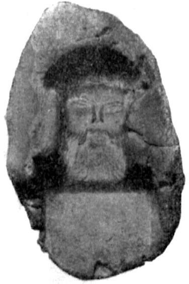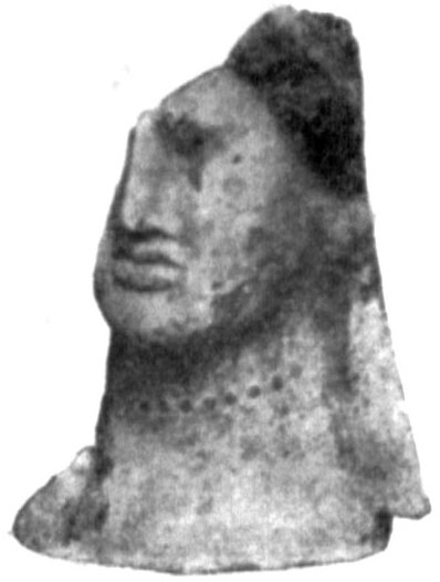 Из обломков простых глиняных сосудов надо отметить часть ручки сосуда из черной глины, украшенной внизу рельефной головкой варварского типа (рис. 41) . Встречаются обломки сосудов, расписанных водяными красками. Часто находимы были и амфорные ручки с клеймами в виде разных штампованных изображений и со штампованными надписями (родосские, фасосские, книдские, синопские, херсонесских астиномов, астиномов неизвестных, городов и др.). Интересно отметить на одной амфорной ручке, по-видимому, приспособление для подвешивания амфоры (см. К.К. Косцюшко-Валюжинича ук. ст. стр. 66). Встречались нередко и амфорные горла с клеймами, обломки черепиц с клеймами, глиняные грузила со штампованными метками (иногда весьма изящные оттиски с резных камней) и без них, глиняные кружки и шарики, формы для лепки терракот (особенно интересна форма для гермы (рис. 42) , с головой бородатого бога). Обломки терракот встречались также нередко. Отметим обломки статуэтки Эрота и Психеи, комического силена, женщины на птице (Леды?), женщины на троне (вероятно богини), голого мужчины, Приапа, бычка, фрагментированную женскую