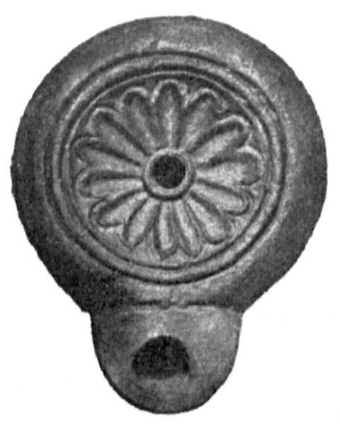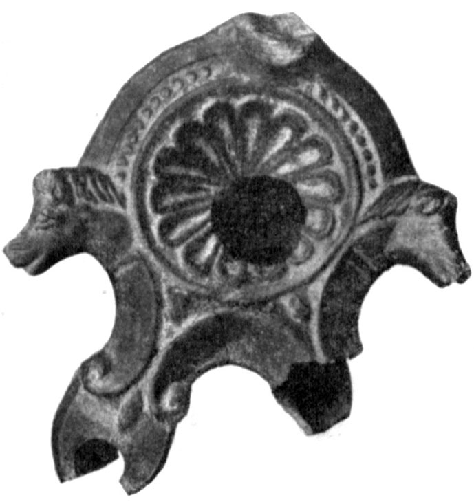 и другой стеклянный остродонный, сверху широкий и круглый. Ограда храма В проходила по пашенным ямам л и м, которые должны, таким образом, принадлежать более древней эпохе. Пашенные ямы ш, щ, о, р и х находятся под фундаментами сооружений поздневизантийской эпохи. Как и ямы л и м, эти ямы должны быть отнесены к римской эпохе. Между ямами о и р открыта цистерна п; она находится также под византийским помещением №38. Такова же цистерна ф. Цистерны п и ф скорее всего также римские. Наоборот, трудно определить время цистерн н, т, у, так как, если они и были сооружены в римскую эпоху, ими могли пользоваться и позднее. Ямы л, м, о, ш и щ вырублены очень аккуратно в скале; на дне они вымощены квадратными кирпичами, стенки их оштукатурены весьма прочной цемянкой. Найдены они забитыми землею и камнями, что было сделано перед сооружением над ними построек в византийскую эпоху. Очень тщательно вырублены и цистерны н и п. При расчистке ямы л найдено несколько интересных предметов древности, между которыми заслуживают особого упоминания фрагментированный римский глиняный светильник (рис. 23) и обломок ручной костяной ложечки, обделанной