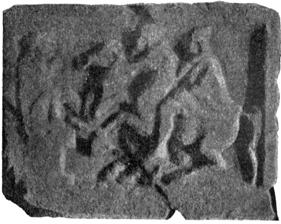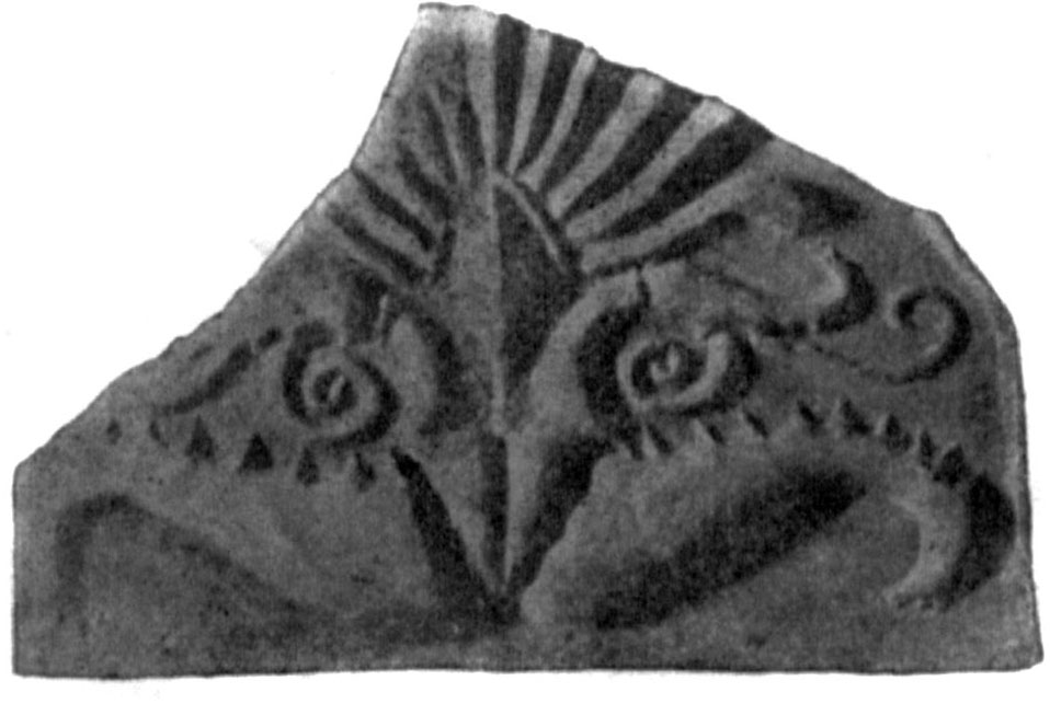 В с.-з. участке раскопок под поздневизантийским слоем открыт также слой римско-византийский. К нему относятся фундаменты зданий (помещения 54-58) с чрезвычайно толстыми (2-5 м) стенами я1—я7, сложенными из бутового камня с заливкой известью. Кладка стен одинакова с внутренней кладкой городской стены римско-византийской эпохи. В помещениях ю1—ю3, которые принадлежали к тому же зданию, что и стены я1—я7, полы были цемянковые. Помещение ф представляет типичный кальдарий римских бань. Из помещения ю3 по обоим углам с.-в. стены выходят водостоки, соединявшиеся с общей сетью городской канализации. К наслоению римской эпохи относятся две прямоугольные пашенные ямы П и Р; в последней на дне найдена соленая рыба. К С.-В. от ямы обнаружены две круглые цистерны; над второй из них, меньшего размера, прошли стены позднейшего времени. Наконец, в восточной части расследованной площади к римско-византийской эпохе принадлежат помещения №№ 94 и 95. В последнем сохранились остатки каменной лестницы. В помещении 94 найдена мраморная плита с рельефом, на котором представлено, вероятно, состязание всадников (рис. 25) .