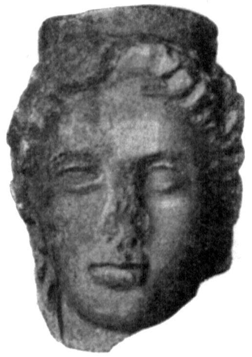 При раскопках описанной части акрополя и указанного холма найдено было много разнообразнейших предметов древности. Подробный их перечень дан в отчете К.К. Косцюшко-Валюжинича [8] . Здесь будут указаны лишь заслуживающие наибольшего внимания, к числу коих относятся: прекрасная мраморная голова кариатиды (рис. 29) ; прекрасный мраморный торс юноши (рис. 30) ; обломок верхней части мраморной статуи нагого мужчины с длинными волосами; верхняя часть сильно пострадавшей мраморной статуи крылатой фигуры; обломки мраморных статуй людей и двух львов; мраморная палица Геракла на круглом пьедестале; нижний левый угол мраморной надгробной плиты, на которой сохранились оконечности лошадиных ног и ноги всадника; прямоугольная надгробная плитка розового балаклавского мрамора с квадратным углублением для бюста умершего; акротерий стелы из известняка, украшенный рельефной пальметкой (рис. 31) ; обломок ноздреватого известняка с грубой рельефной человеческой фигурой; 12 надписей на плитах из мрамора и известняка [9] ; два обломка кровельной черепицы с рельефными орлами (рис. 32) ; каменная круглая чаша, мраморная чаша, фрагментированные каменные ступки и пестики,