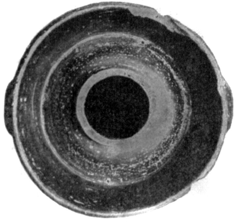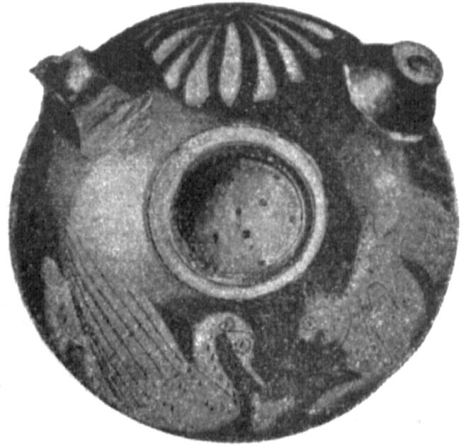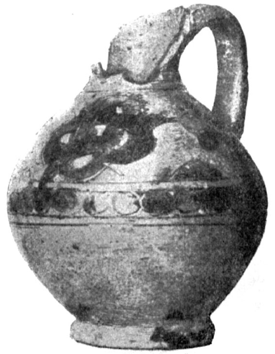 Глиняная посуда. Чашки и миски из простой глины (1466, 1480, 1492, 1496), буролаковая миска (1517), чашка грубой глины (1494), различные кувшины (1466, 1480, 1492, 1493, 1496 и насыпь некрополя у городской стены), остродонная амфора (1492), глиняные тарелки (1494, 1496), амфорка из черной глины (насыпь некрополя у городской стены), глиняные светильники (1465, 1466, 1480, 1481, 1492-1496, 1498-1501, 1503). В насыпи некрополя у городской стены найден светильник (рис. 57) , у которого снизу
