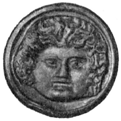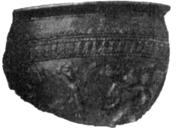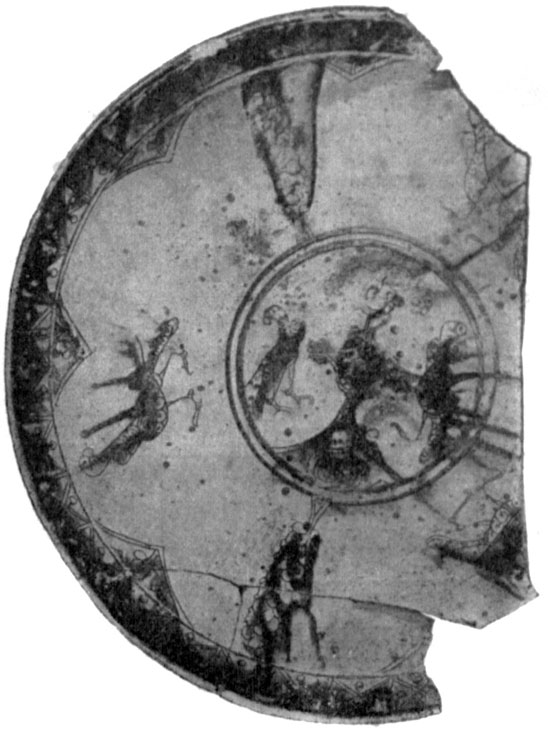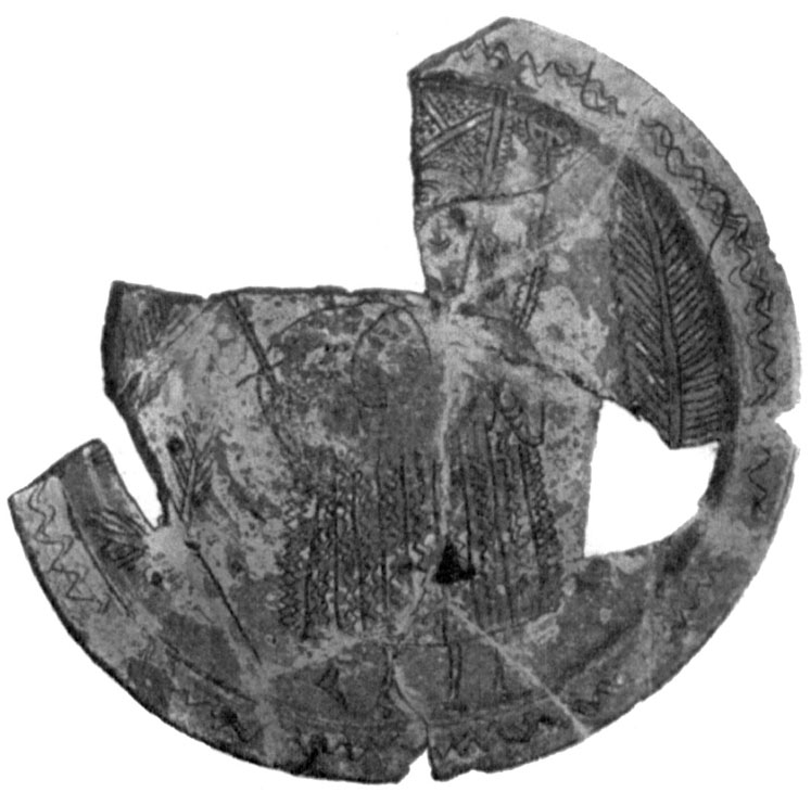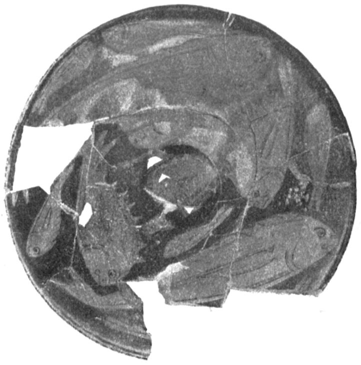 краснофигурное блюдо того же стиля с изображением разных рыб (рис. 34) ; обломок крышки краснофигурной леканы позднего роскошного стиля (с применением накладной белой краски и рельефа), на котором сохранились изображения передней части барана и над ним руки с посохом; два краснофигурные лекифа с пальметками. Далее найдены 1666 обломков краснофигурных сосудов, обломки большого позднего чернофигурного сосуда с изображением состязающихся атлетов, масса обломков сосудов чернолаковых (в том числе более тысячи обломков блюд с углублением в середине), два клетчатых лекифа и обломки сосудов с черным лаковым орнаментом. Особенного внимания заслуживают чернолаковая пиксида (рис. 35а) , крышечка коей украшена рельефным изображением головы Медузы (рис. 35б) , и обломок изящной мегарской чашки, украшенной штампованными фигурами, представляющими