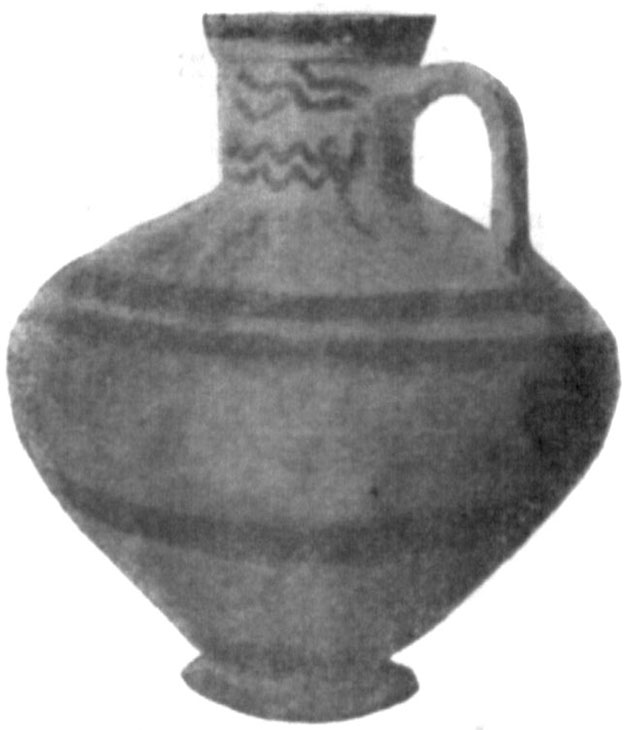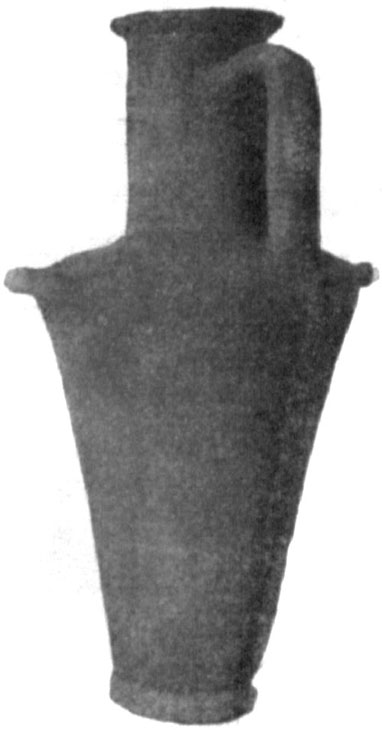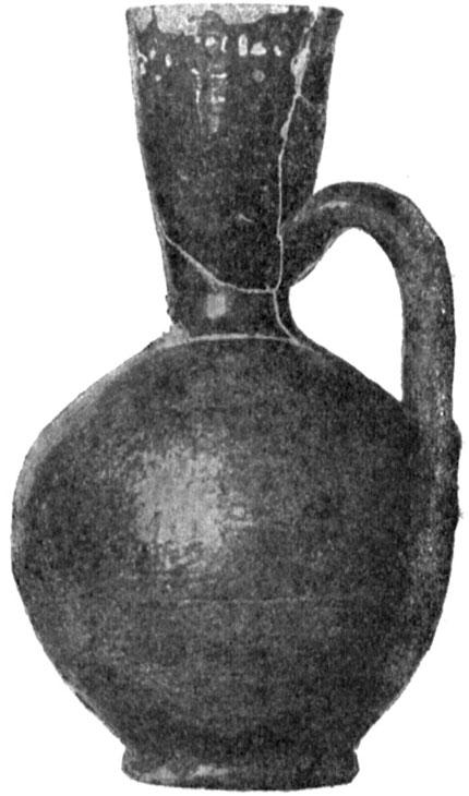 Подобные трубы найдены были в римском укреплении Ай-Тодора. Под полом здания Г проложена целая сеть водостоков из больших черепиц, уложенных на цемянке. Главный водосточный канал ж1 принимал дождевую воду из указанных каменных труб и отводил ее в канал з, проложенный по улице, на которую выходило здание Г. То же назначение было и у небольшого рукава ж2. От водостока ж1 отделялся более узкий черепичный водосток ж3, шедший на юг. Перед колодцем к водосток разветвляется, чтоб отводить воду в цистерны и—и, происходящие еще из древней греческой эпохи. Двери в здании Г были арочные; своды сложены были на прочной цемянке. Здание было разрушено пожаром; в его развалинах была масса остатков обгорелых балок и досок; плиты пола были покрыты также копотью и потрескались от огня. Кроме черепков глиняной и стеклянной посуды и медных монет Херсонеса византийской эпохи, в здании Г найден был интересный глиняный сосуд (рис. 22)