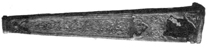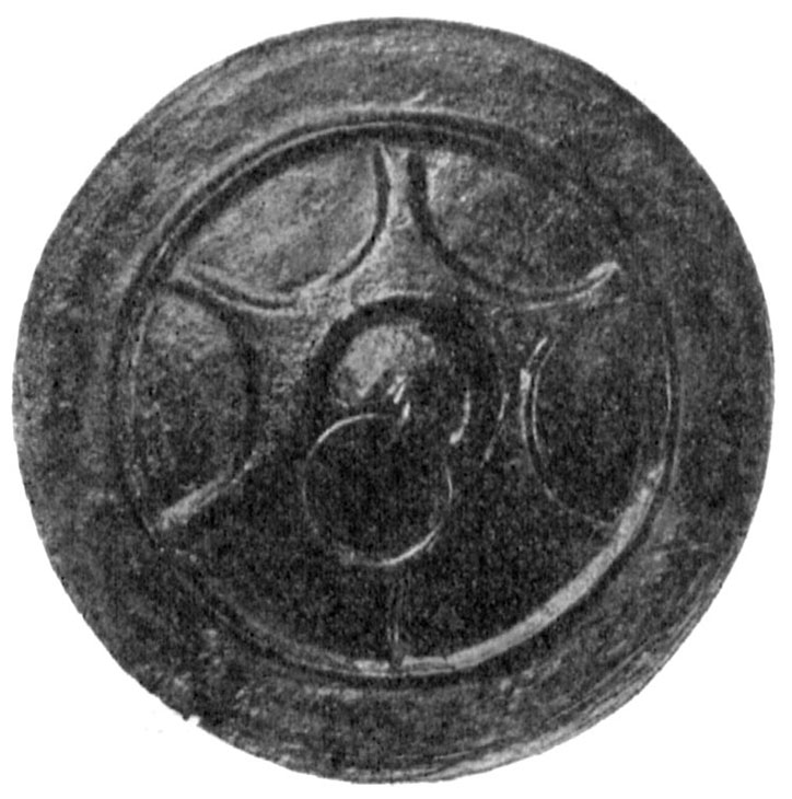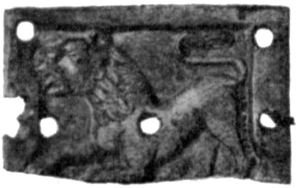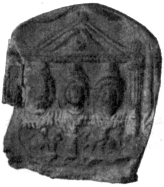 , и рельеф, на котором изображено здание с фронтоном и колоннами: под фронтоном представлены бюсты двух мужчин по сторонам бюста женщины; у всех на головах островерхие шапки; в нижней части рельефа под тремя бюстами
