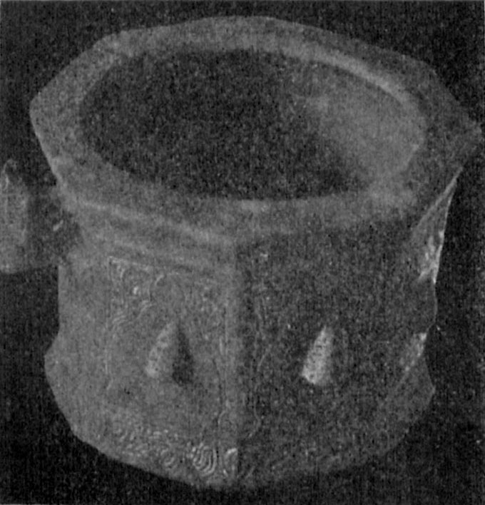 миска, ковш, крышечка, светильник, ступка (рис. 49) , кимвал (рис. 50) , татарская чернильница (калямдан, рис. 51) . Наконец, найдено 1187 монет, принадлежащих различным эпохам Херсонеса [12] .