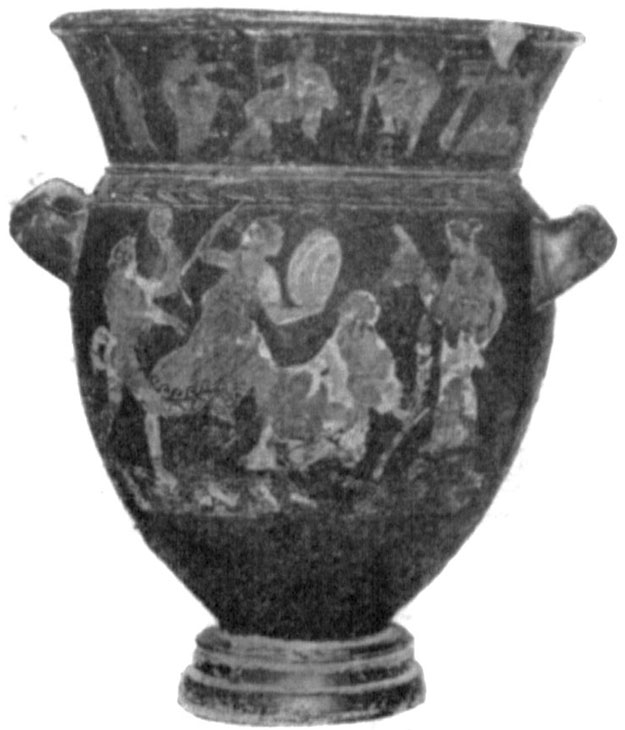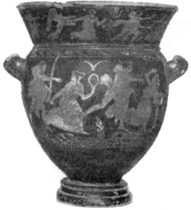 Две урны были расписаны водяными красками: №1510 со следами орнамента, исполненного черной и красной краской, и № 1518 (рис. 53) , украшенная орнаментом белого цвета. Интересны урны № 1519 (рис. 54) , представляющая форму гидрии из светлой глины без всяких орнаментов, и № 1517 (рис. 55a, 55б, 55в) — великолепный краснофигурный кратер позднего роскошного стиля с изображением у верхнего края юношей и девушек и на туловище Диониса с его фиасом. Отверстие кратера было закрыто чернолаковой чашкой. Вокруг отверстия, у начала верхнего пояса, образующего венчик кратера, просверлены 4 симметрично расположенных дырочки.