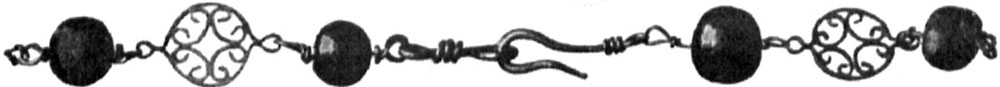 — Ожерелье в виде цепочки (рис. 56), состоящей из золотых выпуклых розеток и сирийских чечевицевидных гранатов, надетых на золотой проволоке; розетки и гранаты соединяются между собою особыми петельками; застегивалось ожерелье крючком и петлей, сделанными на концах (№ 1492). — Различные бусы и привески (1465, 1493). — Перстень массивный с плоским овальным щитком, на котором вырезано имя — Различные индикации (1492; одна с изображением Афины в шлеме). — Две прямоугольные пронизи, украшенные штампованными розетками, с двумя дырочками для нанизывания, от браслета (1503), совершенно одинаковые по рисунку и размерам с лигнитовыми пронизями (тоже от браслета) из склепа № 1465. — Различные бляшки и пуговки (1494, 1508, 1512, 1513), листики и пластинки (1503, 1508, 1511, 1514). — Два колечка, может быть, части пряжки от обуви (1503). — Обломки браслета, подобного найденным в 1896 и 1898 г.г. (1508) [14] .