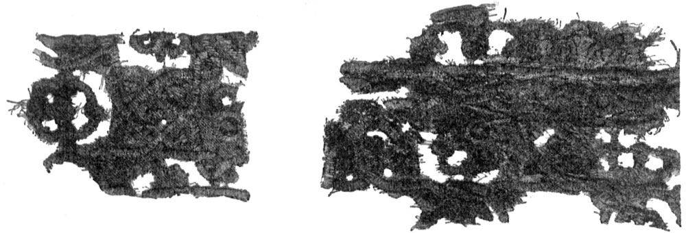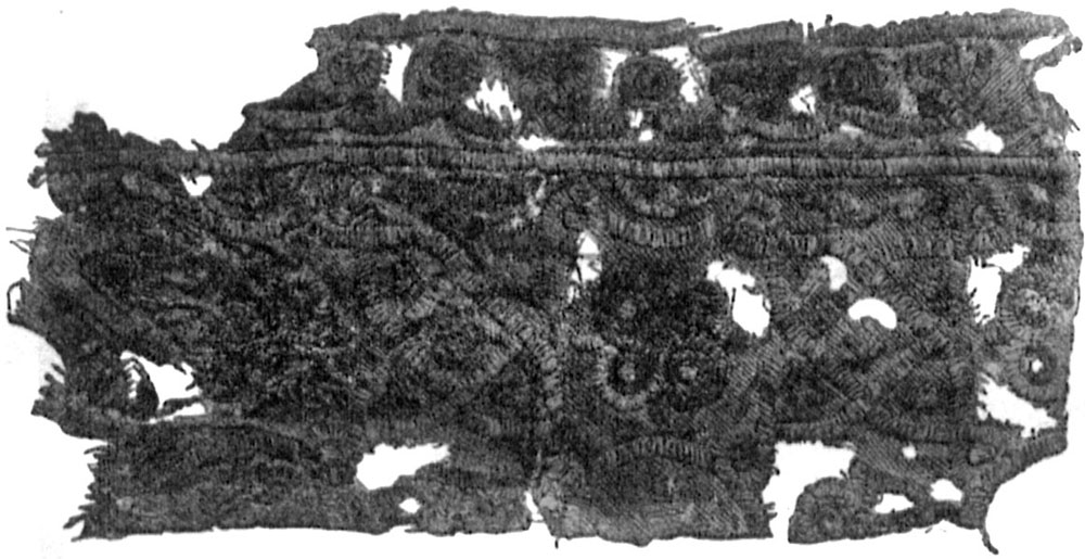 ударов. Из находок в усыпальнице наиболее интересны обрывки плотной шелковой ткани с нашитыми гладью украшениями декоративного характера