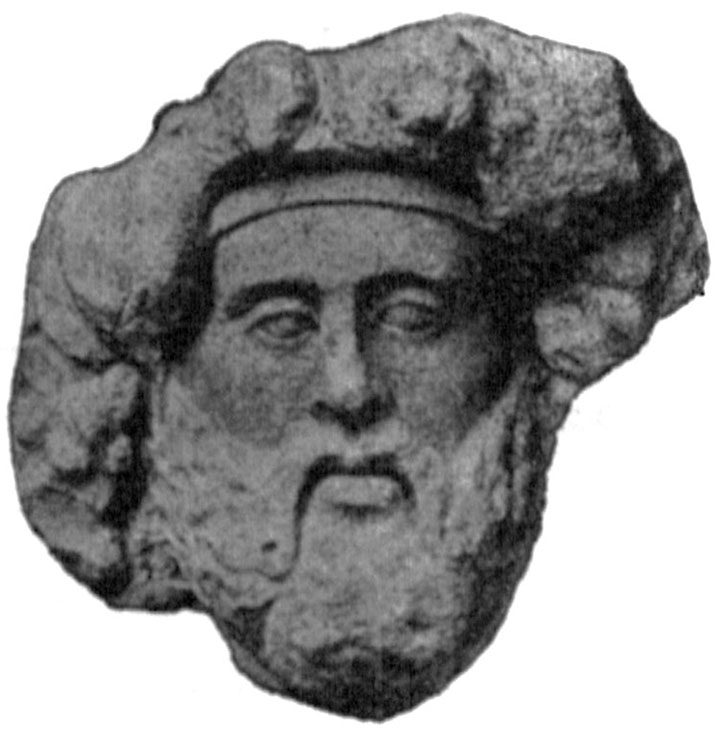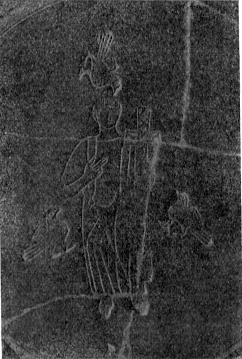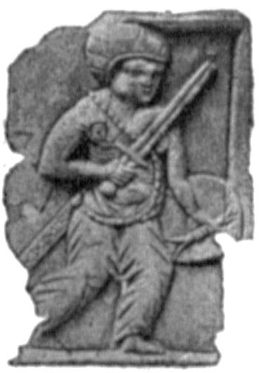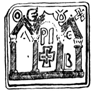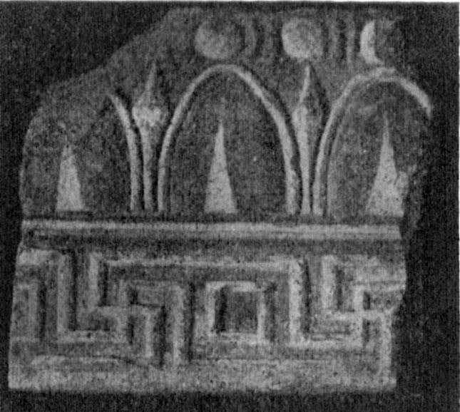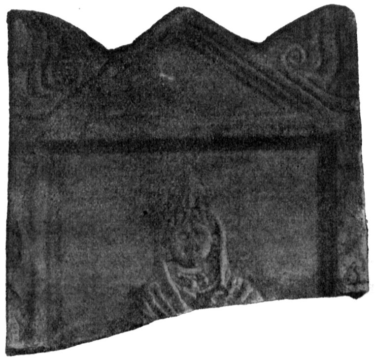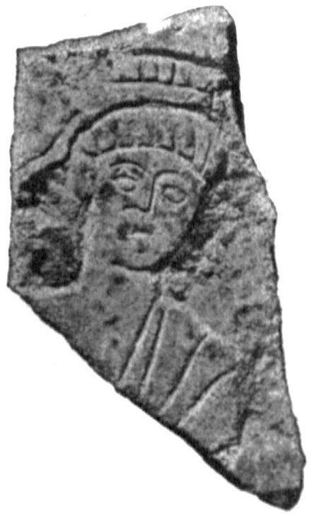 Каналы, открытые на улицах, относятся к византийской эпохе. В помещении этой же эпохи № 4 обнаружены два грушевидных колодца а и б. На расследованном участке обнаружены еще пашенные ямы ж (с остатками соленой рыбы), з, и и л. Кроме упомянутых уже находок, при раскопках внутри монастырской усадьбы найдены различные архитектурные обломки, греческие и латинские надписи [2] , обломки скульптур из мрамора, обломок известкового рельефа с изображением трапезы героизированного умершего, обломки различных сосудов из мрамора и камня, мраморные и каменные пестики и растиральники, оселки, обломки мраморного византийского рельефа (рис. 83) , жернова для ручных мельниц, маленькие метательные камешки, каменные пряслица, золотые серьги, серебряное кадило, украшенное штампованными погрудными изображениями святых в медальонах, пальметками и цветами, бронзовая курильница, ступня бронзовой статуэтки, обломки бронзовой посуды, бронзовое массивное кольцо с глухим расклепанным