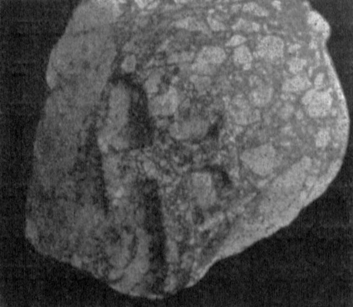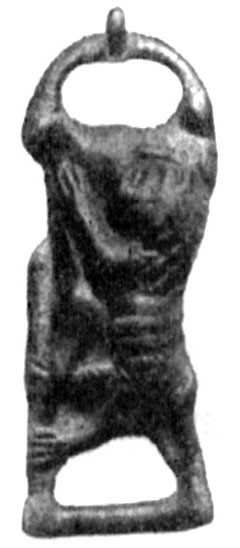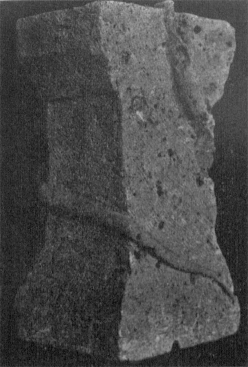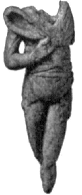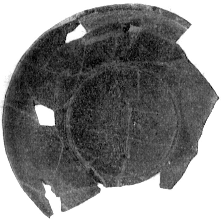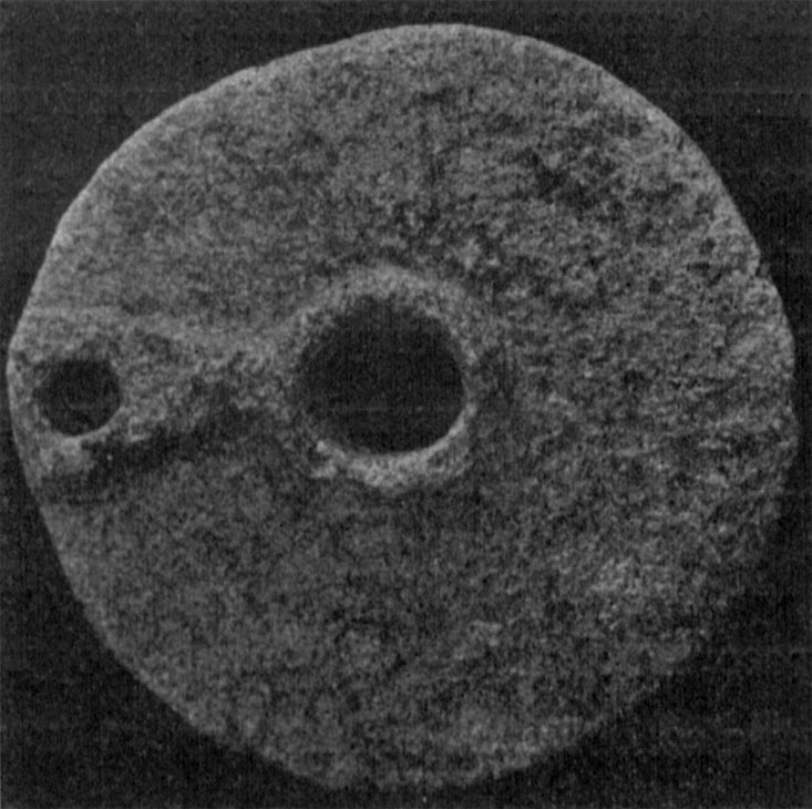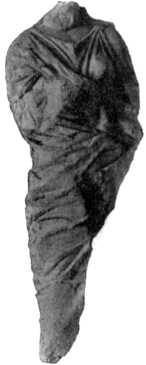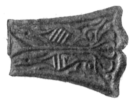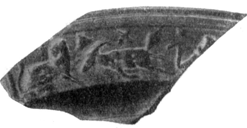 При раскопках в этой части городища найдены следующие предметы древности: обломки мраморных капителей колонн (рис. 87) и другие архитектурные обломки, греческие [4] и латинские [5] надписи, фрагментированная мраморная женская статуэтка (рис. 88) , мраморная мужская голова (рис. 89) , другие обломки мраморных скульптур, обломки различных сосудов из мрамора (на (рис. 90) представлен обломок византийского сосуда с рельефным крестом), обломок мраморного византийского рельефа (рис. 91) , различные монеты, бронзовые кресты и образки, бубенчик, обломок цепи, пуговки, перстни, наперсток, иглы, рыболовные крючки, свинцовые каменные и глиняные грузила, каменный жернов с отверстием сбоку для вращательной палки (рис. 92) , глиняные и каменные прясла, глиняные игральные шарики, обломки сосудов чернолаковых, простых глиняных, поливных (интересен обломок, представленный на рис. 93 ), обломки стеклянной посуды, обломки стеклянных браслетов, костяные шильца, шашки, резная костяная пластинка с изображением бегущего воина (рис. 94) , костяная мужская статуэтка с отломанными левой рукой, ступнями ноги и головой (рис. 95) , бивни кабана, материалы для изделий из кости.