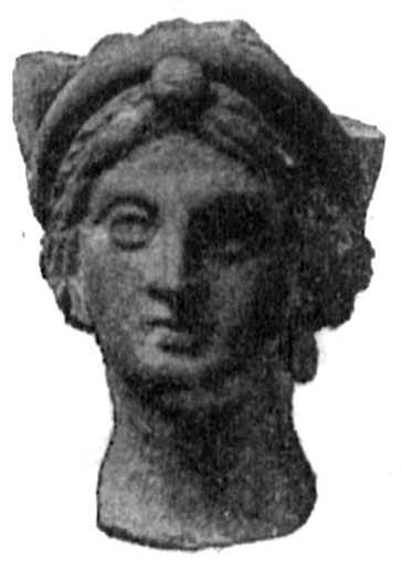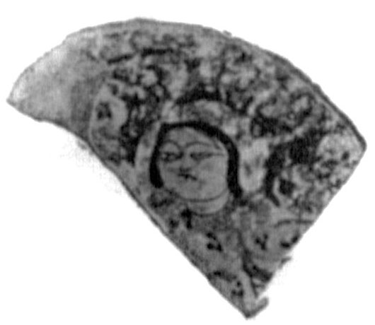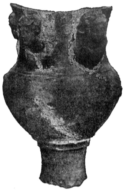Из краснолаковых интересны обломок края блюда со штампованными фигурами (рис. 73) , фрагментированное блюдо с изображением святого с крестом и трех голубей (рис. 74а и 74б ) и фрагментированная тарелка со штампованным крестом. Среди простых глиняных сосудов надо отметить фрагментированную вазу (рис. 75) , украшенную в верхней части тремя рельефными женскими головками в плющевых венках (менады), сделанными по одной форме. Кроме того, найдены были обломки византийской поливной и стеклянной посуды, круглые стеклышки от перстней, обломки стеклянных браслетов, стеклянный штампованный кружок, стеклянные шашки, костяная шашка, обломки резных костяных шкатулок и костяных пластинок, костяная ложечка, копоушка, ручка с человеческой фигурой, точеное шильце, роговая иголка, бивни диких кабанов, козьи рога и пр.