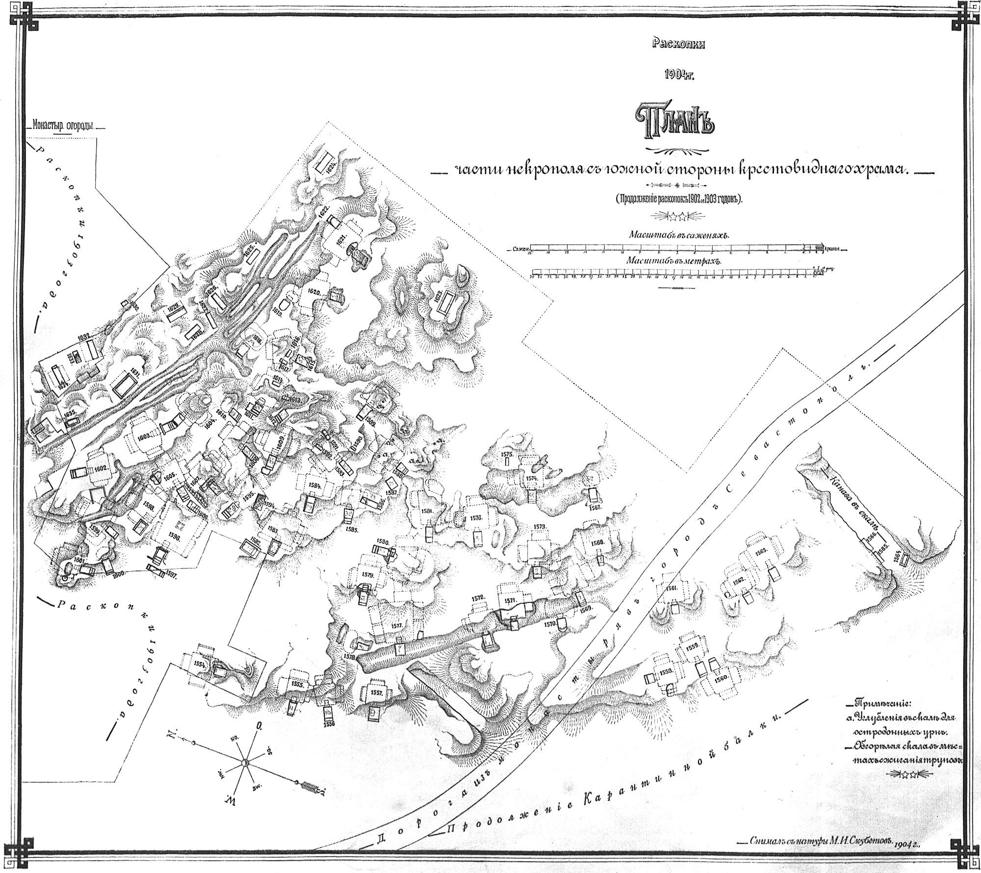 Храм А, как и только что названный, — трехапсидный. Средняя большая апсида расположена над древнейшей пашенной ямой а. Эта яма была забита землей и мелким камнем и укреплена поперечной стеной, сложенной на извести. К С. от этой ямы расположена другая, открытая в 1901 г., представляющая также остаток древнейшей эпохи. К Ю. от южной апсиды сохранилась часть кирпичного пола (в) и два прямоугольные цементированные углубления б и г. Перед западной стеной храма с южной стороны, в особом отгороженном помещении, открыт поглощательный колодец е. К Ю. от храма обнаружена наполненная костями усыпальница ж. Храм А был довольно рано разрушен, и в позднейшую византийскую эпоху на его развалинах были воздвигнуты новые постройки и водосточные каналы д—д, которые соединялись с каналом, открытым в 1901 г. На берегу моря, на С.-В. от храма А, под часовней, открытой в 1901 г. и разрушенной при недавнем сооружении новых батарей, обнаружены остатки постройки, состоявшей из трех помещений (№№ 3-5) с тремя круглыми колодцами, вырубленными в скале и оштукатуренными цемянкой (з, и, к; последний колодец каналом л соединялся с помещением № 4). К Ю. от храма А проходила первая (с С.) продольная улица, соединявшаяся с поперечной улицей, доходившей до названной продольной и за ней заканчивавшейся узким проулком, мощеным плитами. Последний вел через каменную лестницу к площадке, выложенной мозаикой. К З. от узкого проулка, ведшего к Уваровской базилике, находятся жилые помещения №№ 6-11. Наконец, к Ю. от продольной улицы обнаружены остатки небольшой трехнефной базилики с мраморной и мозаичной отделкой. В продольной и поперечной улицах найдены водосточные каналы, в которые ведут многочисленные рукава.