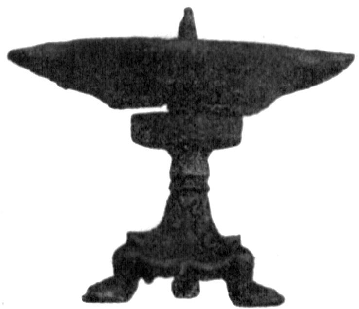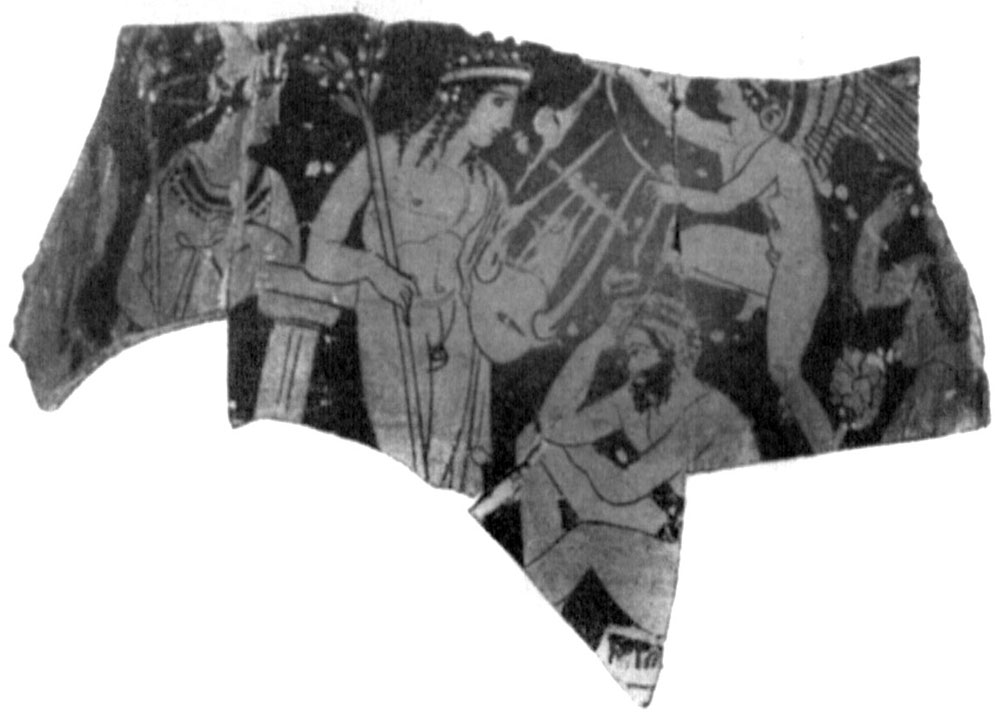 В некрополе найдено много предметов древности: золотые листики, серьги, перстни (есть с сердоликом), трубочка с тремя ушками для подвешивания, украшенная листиками, розетками, завитками, жгутиками и шариками филигранной работы (исчезли находившийся в большом полукруглом гнезде камень и кружки, закрывавшие трубочку с обеих сторон), 13 бляшек в виде островерхих шапочек с двумя дырочками для привешивания [9] , серебряные ложечки и пряжка, бронзовые браслеты, фибулы, серьги, пряжки, замок с ключом, ключи, наперсток, стержень, зеркала, монеты, подставка для светильников ( рис. 103 ; на подставку поставлен глиняный светильник), ложечка (найденная с мраморной дощечкой; может быть, инструменты для работы коропластов) [10] , часть цепи, железные ножи, стригили, наконечник копья, перстни, пряжки, часть большой трубочки с двумя цепочками для ношения, глиняная посуда (краснофигурные обломки, из которых на изображенном на рис. 104 представлена победа Аполлона над Марсием, чернолаковая посуда, мегарские чашки, краснолаковые сосуды, среди которых есть обломки с клеймами, простая глиняная посуда, обломки амфор с клеймами), куски черепиц